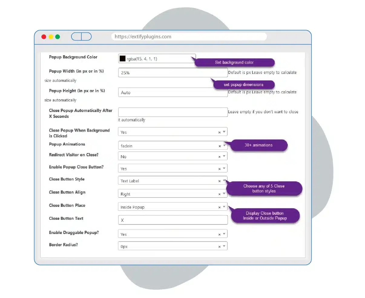 - Popup Width & Height: Adjust the popup width and height in PX and in percentage
