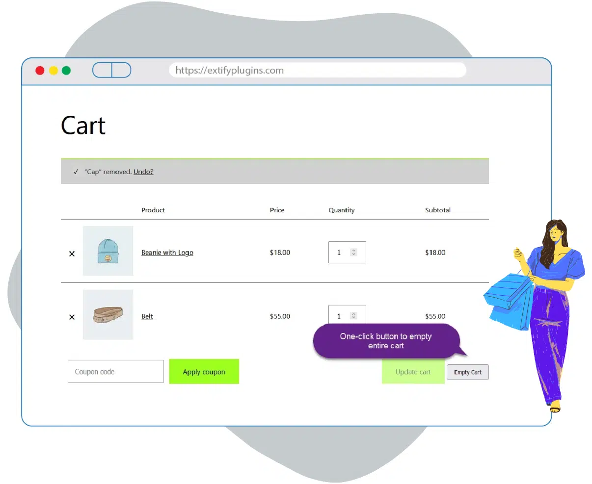 We believe in simplicity, and that’s why our plugin’s second feature introduces a convenient ‘Empty Cart’ button right on the front end of your store. Your customers can now declutter their carts with a single click, making their shopping journey smoother and more efficient.