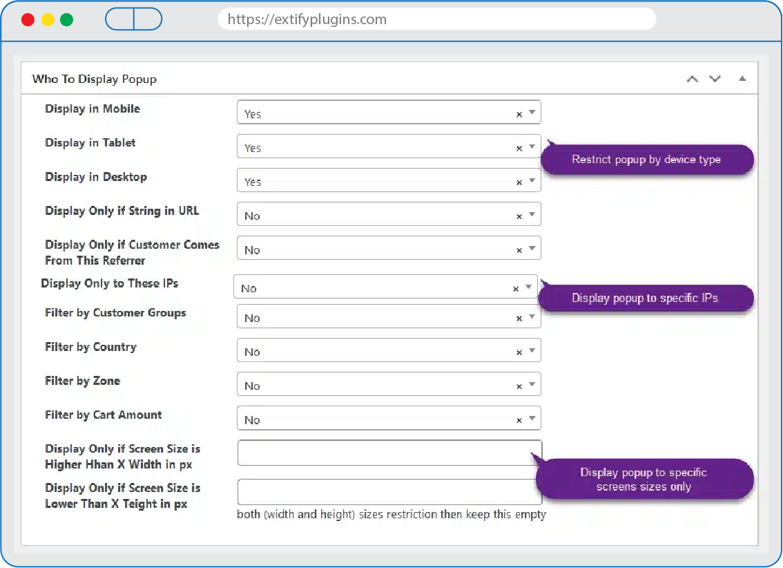 Display the popup on specific product pages, categories, or CMS pages. Additionally, target specific customer groups, countries, zones, stock quantities, prices, product attributes, or cart amounts for a more personalized approach.