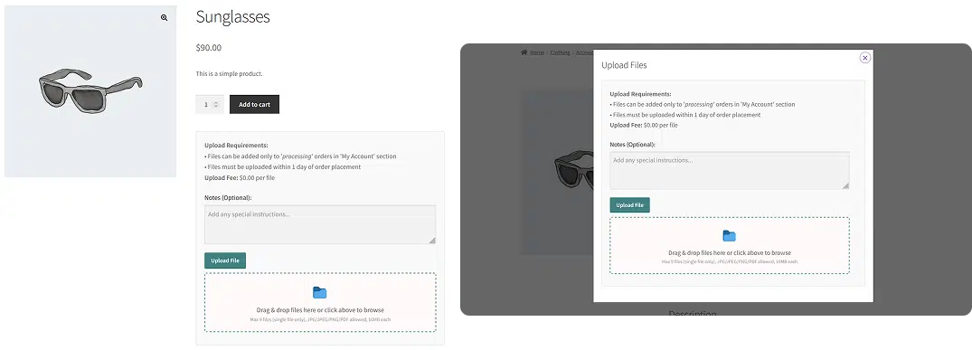 It allows customers to upload files directly on product, cart, or checkout pages when placing an order. This is useful for personalized products, custom designs, documents, or artwork.