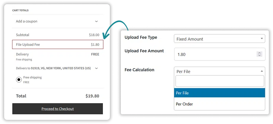 Add fixed or percentage-based fees for each file upload per file or per order.