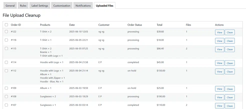 Manage all uploaded files in one place with a detailed dashboard showing order ID, customer name, product, date, order status, total order value, number of files uploaded, and actions. Click “View” to go to the product page where you can download, approve, disapprove, or delete the files.