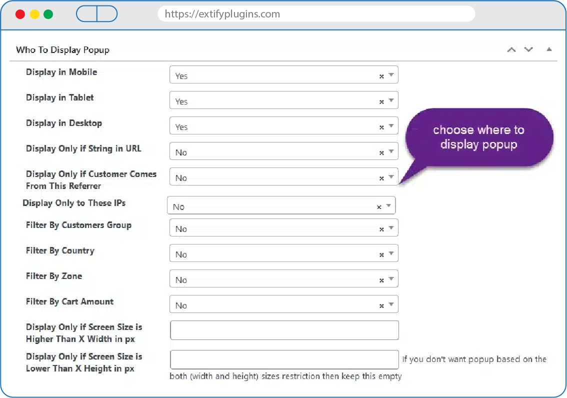 - Restrict Popup Display: Limit popups to specific customer groups, countries, sources, or cart amounts for targeted messaging.