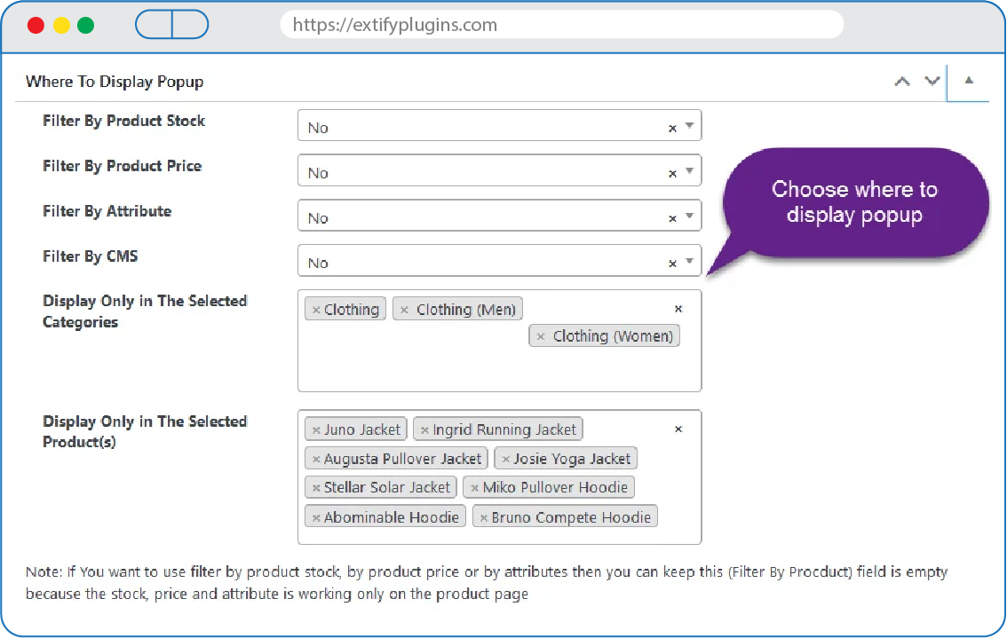 - Targeted Display Options: Show popups based on criteria like stock, price, or product category for increased relevance.