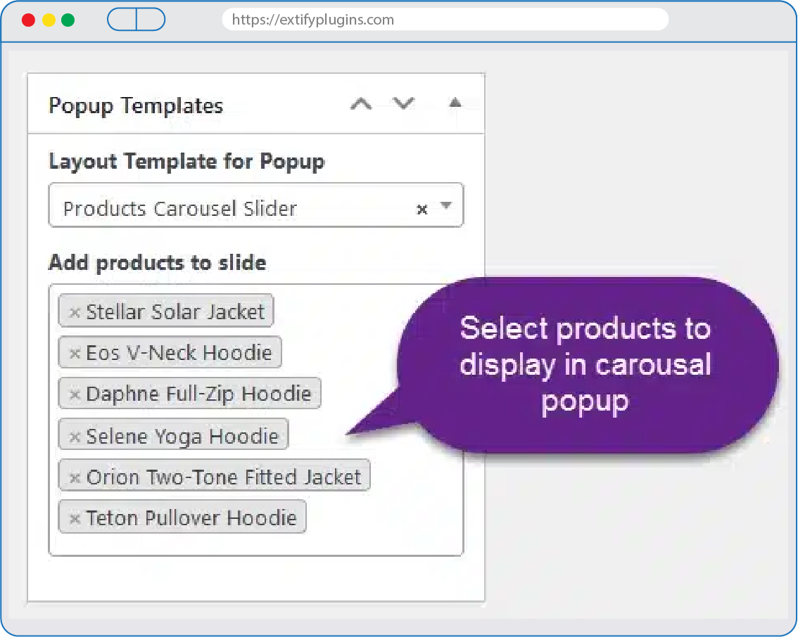 It displays products in a carousel inside a popup to grab customer attention.